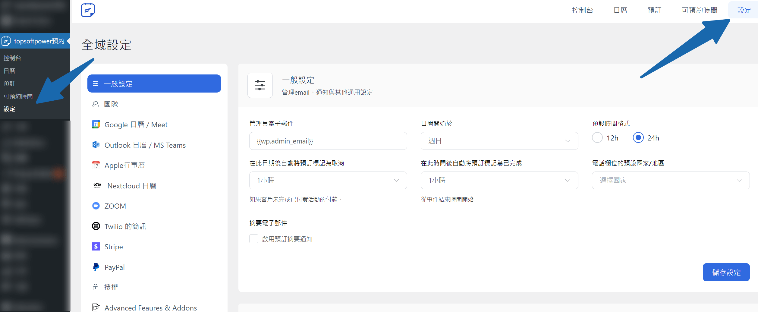 從 topsoftpower線上預約系統 控制台導覽至「設定」 。這將帶您進入topsoftpower線上預約系統 的全域設定頁面,您可以在其中設定預訂的全域電子郵件設定