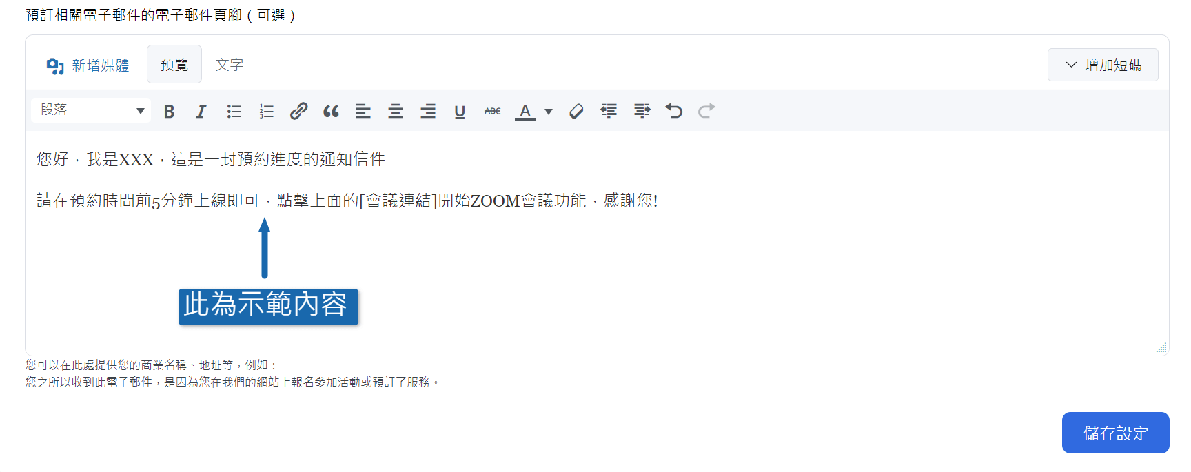 電子郵件頁尾可讓您自訂預訂相關通知電子郵件的頁尾。