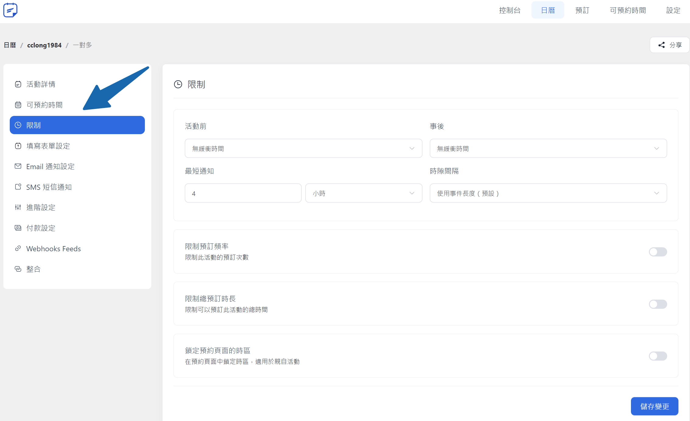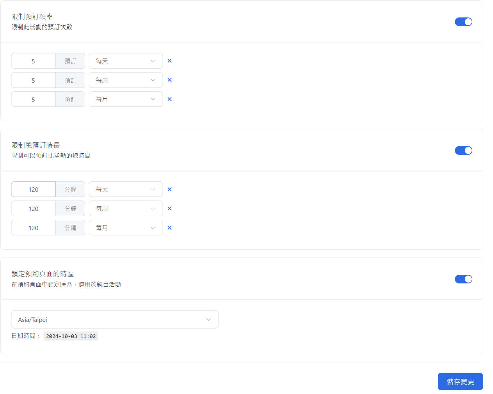 決定使用此功能預訂活動的頻率。您可以設定每日、每週或每月的預訂限額。