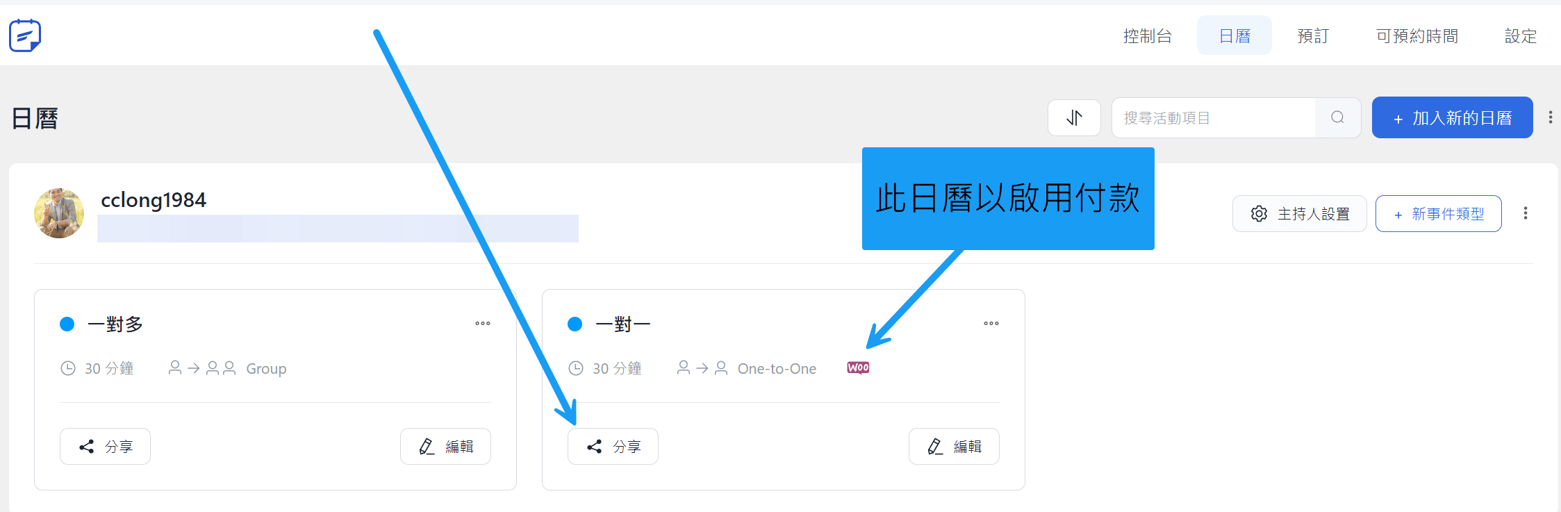 前往topsoftpower線上預約系統 控制台上的日曆,然後按一下您要為其設定付款選項的特定預訂的編輯按鈕。
