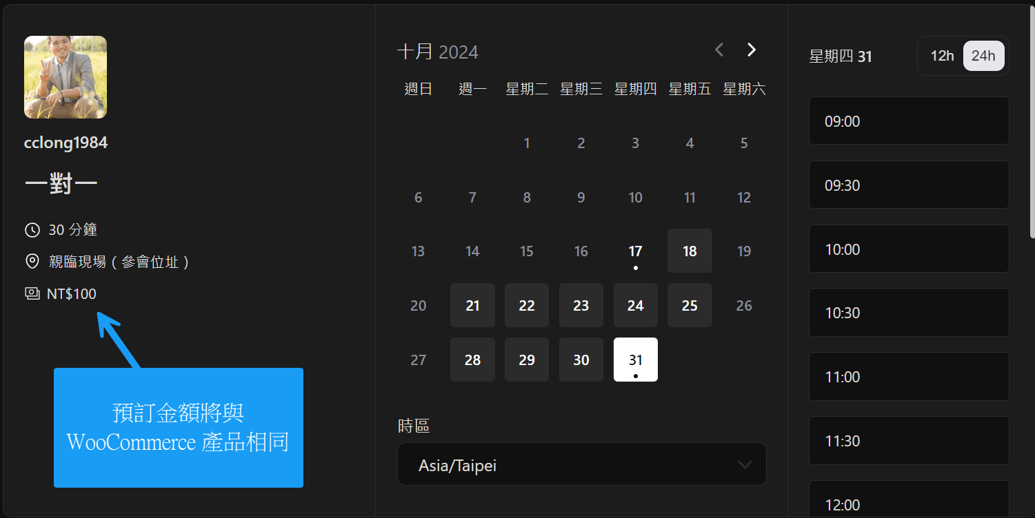 若要為您的預訂啟用付款選項選擇 使用WooCommerce Checkout 付款時,需要先在WordPress網站後台新增一個商品才能下拉做選擇。